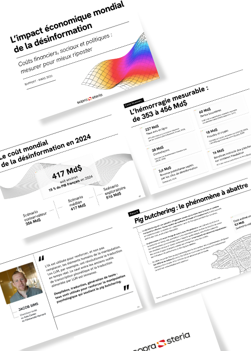 Through all these actions, Sopra Steria is stepping up its efforts in the fight against information manipulation, whether via the Pégase think tank, a genuine forum for decompartmentalisation and innovation, or via the performance of its engineers and consultants, who are both "trusted integrators" and "technological scouts" in the fight against information manipulation.